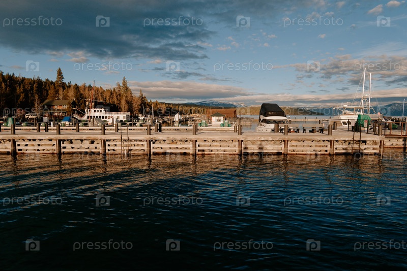 Спокойный вид на берегу воды с примыкающими судами и живописным ландшафтом