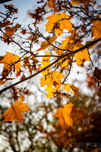 Золотые листья светятся. Желтый лист освещает мягкое небо. Яркие осенние ветви контрастируют с облачным горизонтом