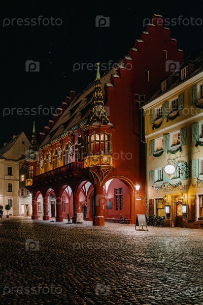 Ярко освещенное историческое здание с видом на тихую площадь Cobblestone Plaza