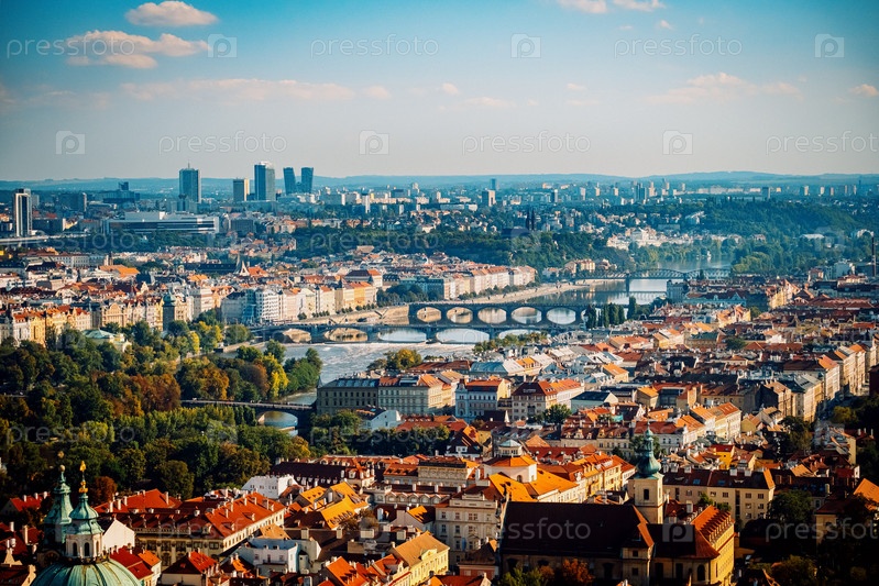 Праздничный пейзаж Праги, исторические и современные сооружения купаются в вечернем свете над Прагой