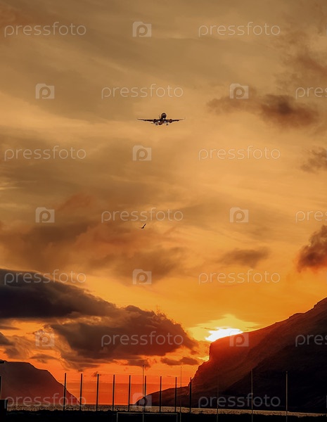 Силуэт самолета, приближающегося к береговой линии во время захода солнца с ярким небом и горным фоном