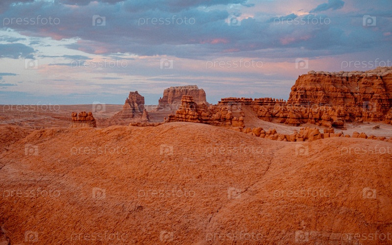 Впечатляющий закат солнца излучает свечение на многослойных песчаных образованиях в Юте
