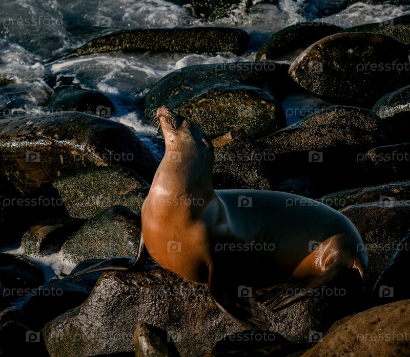 Морской млекопитающий спокойно отдыхает на солнечных камнях среди мягких волн и тихой прибрежной среды