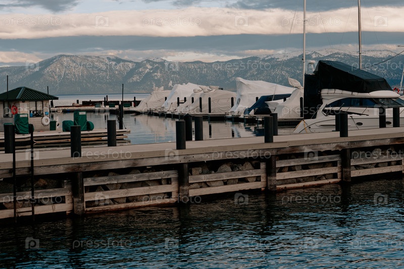 Спокойная марина, окруженная заснеженными вершинами и облачным небом