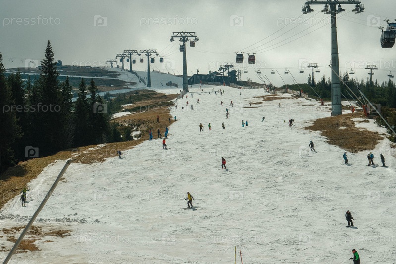 Покрытый облаками зимний пейзаж с лыжниками и живописными видами на горы