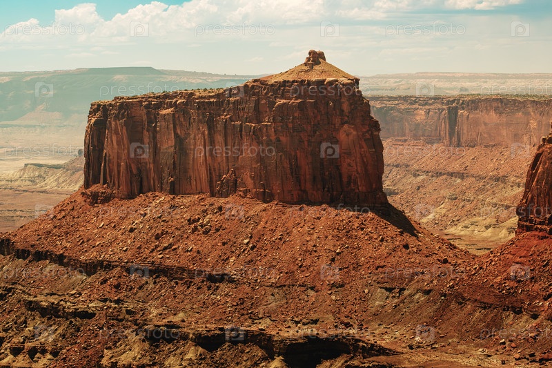 Огромный каньон с песчаными скалами, обширная пустынная долина со слоями каменистых образований под голубым небом