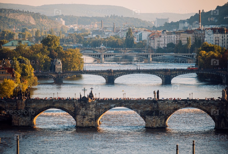 Отражения, сверкающие на Чарльзском мосту во время вечерней сцены захода солнца