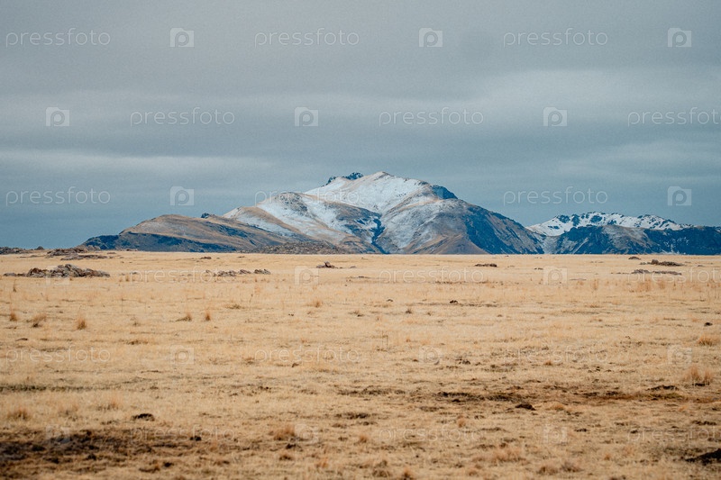 Огромные желтые луга, простирающиеся к снежным горным вершинам поблизости