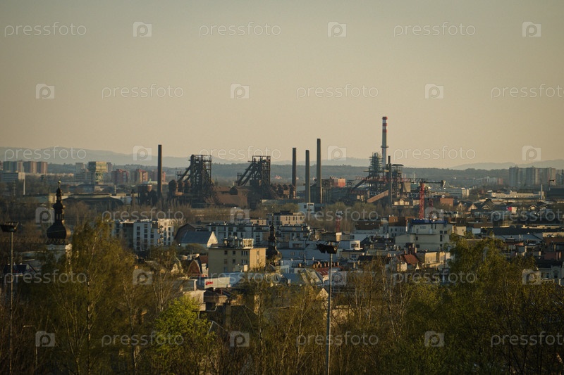 Дальние промышленные объекты против туманного неба с пригородной зеленью и мягким вечерним светом