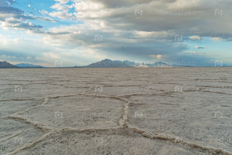 Широкая соленая поверхность с штормовыми облаками, широкие трещины соленой плоскости с надвигающимися облаками и горными силуэтами