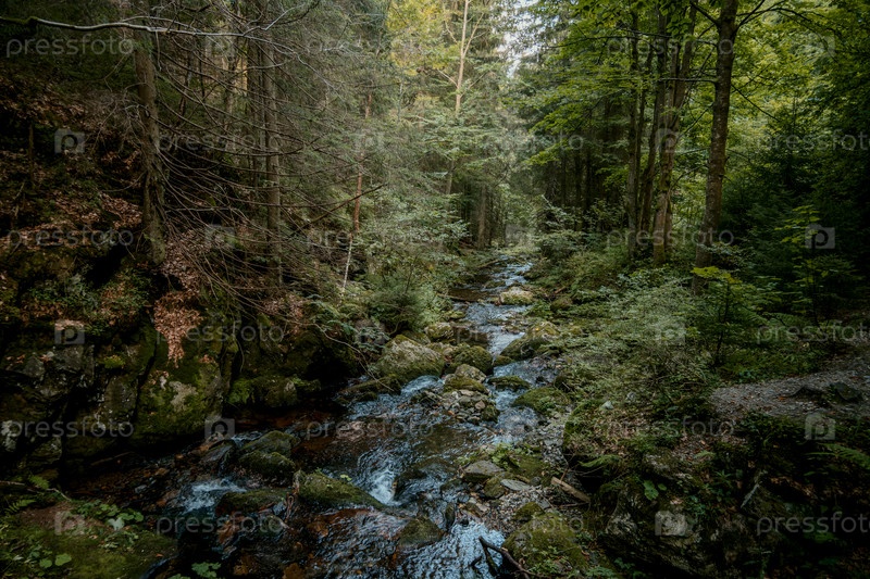 Спокойный лесный ручей с оживленным потоком воды, тихий лесной ручей со стремительными водами и затененной крышей