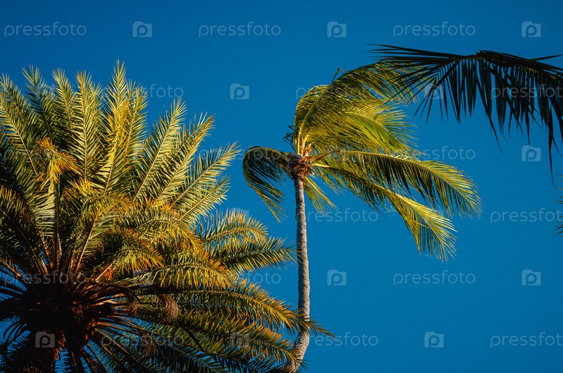 Яркие зеленые листья качаются в тропическом ветре. солнечные пальмы с текстурированными листами на прозрачном голубом небе
