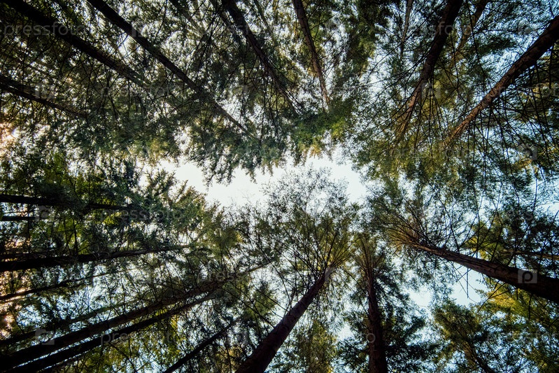 Повышенный вид на пышную навес, просмотр над лесом раскрывает ветви и солнечный свет фильтрует через