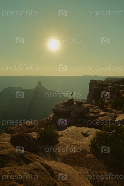 Утренний свет освещает скалистые склоны с видом на далекую туманную долину