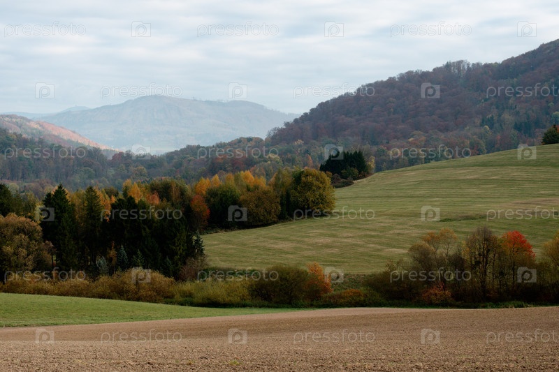 Спокойный природный пейзаж с обширными пастбищами и осенними деревьями