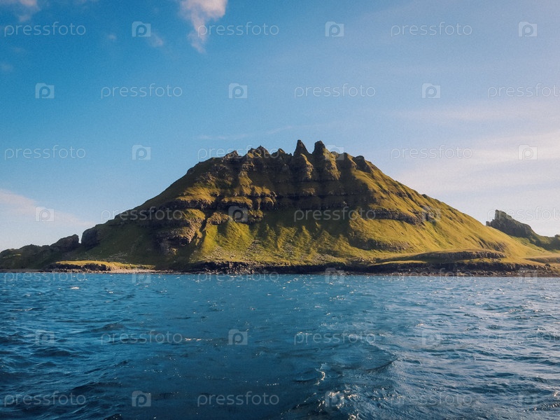 Спокойная бухта острова с голубым океаном и травянистыми холмами для фотографии