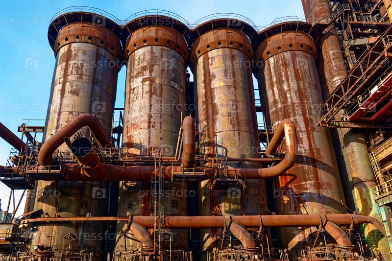 Массивные суда и соединяющие трубопроводы изображают чешский промышленный ландшафт и историческое значение