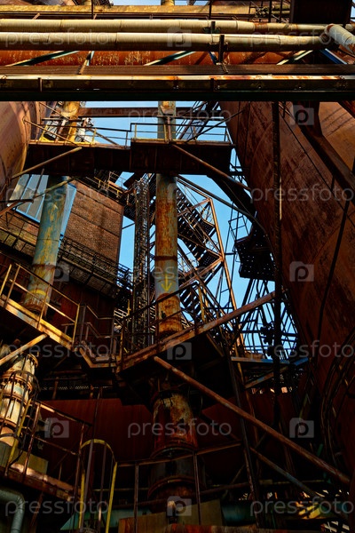 Старый завод с трубами и лесами. выветриваемая высокая печь, окруженная трубами и лестницами