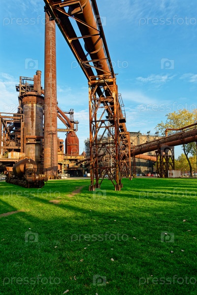 Стальные конструкции и ржавые трубы установлены против живого парка под ярким небом