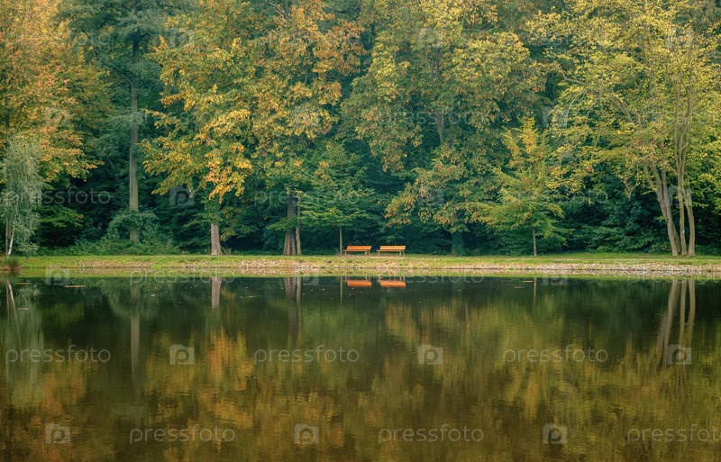 Спокойная обстановка на берегу озера с деревянной скамейкой, окруженной осенними листьями и зеркальным отражением