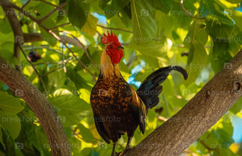 Живая курица расположена на ветке дерева в пышном гавайском садовом ландшафте