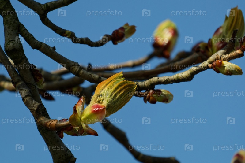 Живая сцена зарождающихся каштановых деревьев и появляющихся листьев в весенней атмосфере