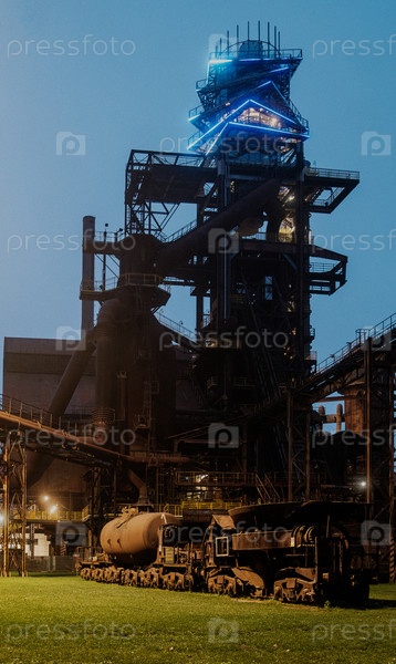 Силуэт старого коксового завода с ржавыми вагонами и драматическими эффектами прожекторов на текстурированных поверхностях