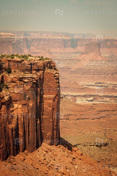 Пустынный каньон с возвышающимися скалами. отдаленная засушливая долина со слойными породами и далекими плато