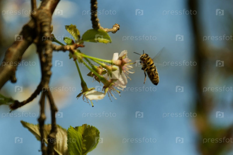 Медоносная пчела парит над белым цветом в чешском саду, захватывая опыление под нежным солнечным светом
