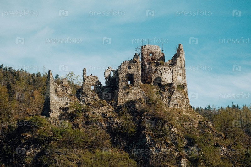 Исторический замок на горе.Руины замка расположены на вершине холма с пышными окрестностями и ярким небом