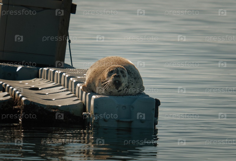 Спокойный тюлень неспешно отдыхает на плавучем пирсе в безмятежном прибрежном пейзаже, залитом золотистым светом и окруженном мирной атмосферой