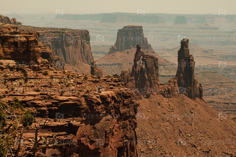 Скалистые структуры, возвышающиеся над засушливыми ландшафтами каньона