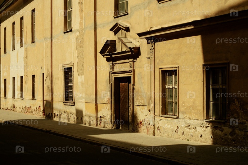 Спокойное изображение исторического фасада с деревенскими текстурами и мягкими тенями в мирной обстановке