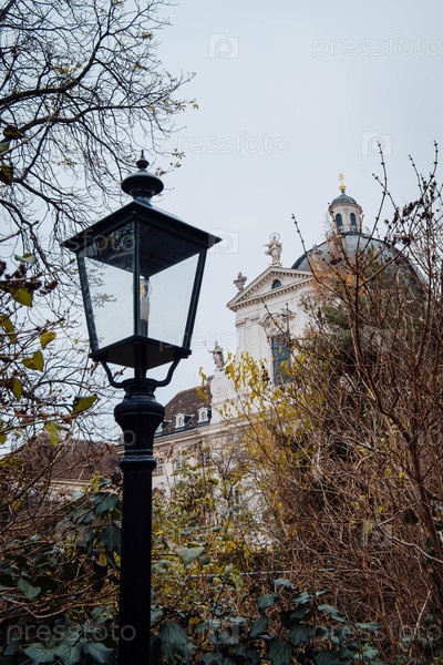 Спокойная сцена со старыми уличными лампами и осенними листьями