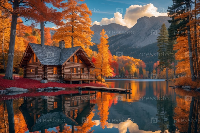 Дом здания ландшафтный фон красные и желтые листья осень-осень осенний лесной парк AI Generative
