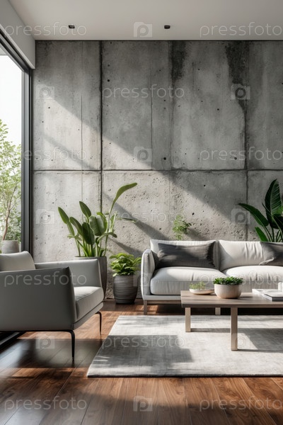 AI генеративный современный уютный интерьер гостиной бетонная серая стеновая мебель комфортабельный дизайн дома