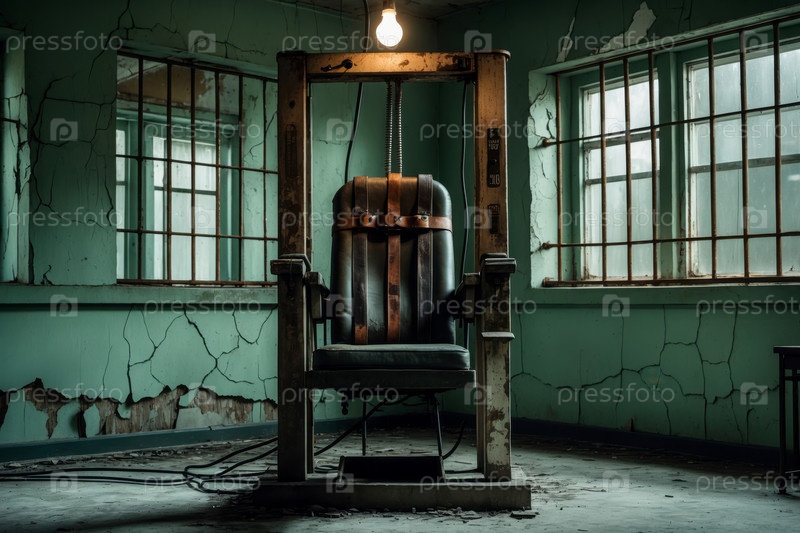 Интерьер камеры смертной казни, наказание заключенный виновен в электрическом стуле AI Generative