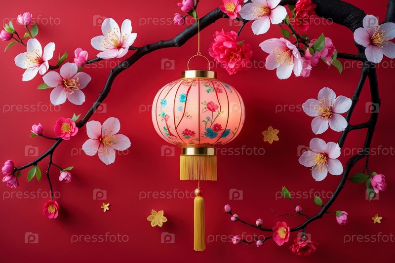 AI Generative Background Традиционные китайские символы Нового года с фонарями и вишневыми ветвями