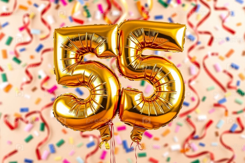 Гелиевый баллон на день рождения номер пятьдесят пять, фигура из золотых букв 55 праздник праздничный фон