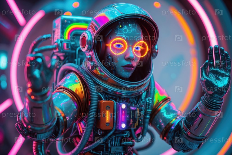 Человекоподобная женщина в футуристическом неоновом костюме, человек на будущем научно-фантастическом завтрашнем фоне AI Generative