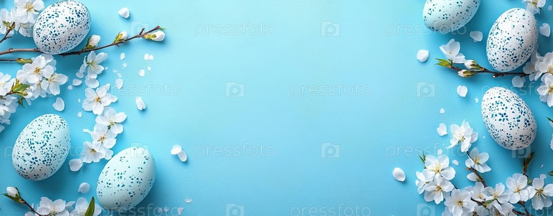 Пасхальные яйца и белые вишневые цветы на ярко-синем фоне. концепция "Счастливого Пасхи"; простой весенний шаблон, поздравительная открытка, баннер. lue
