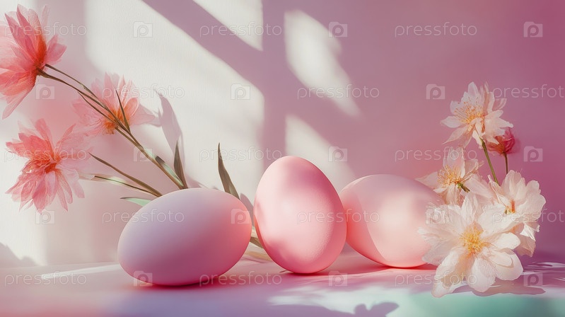 Мягкие розовые яйца с цветами. Очаровательные вишневые цветы и пастельные яйца изображены элегантно. Минималистский розовый фон с деликатными цветочными акцентами и гладкими тенями