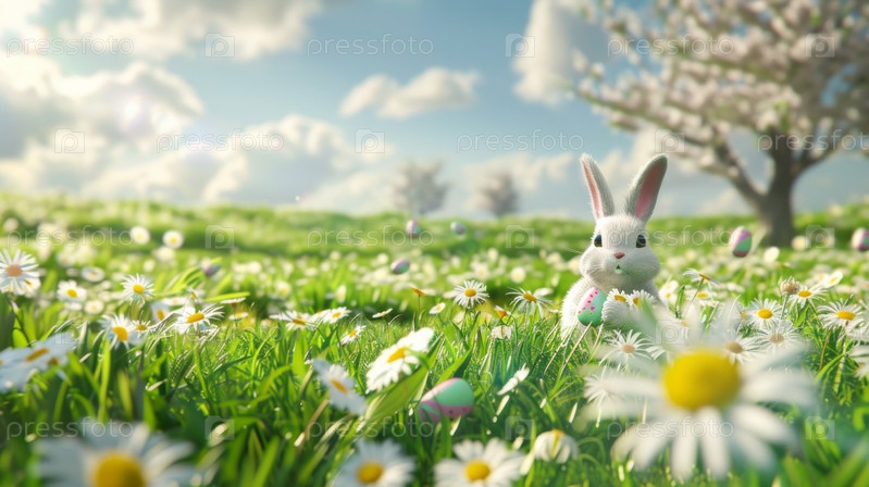 Пасхальный пейзаж, кролики с красочными яйцами и ромашками на лугу под прекрасным небом