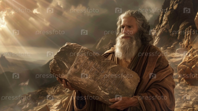 Моисей несет каменные скрижали с написанными на них Десять заповедей
