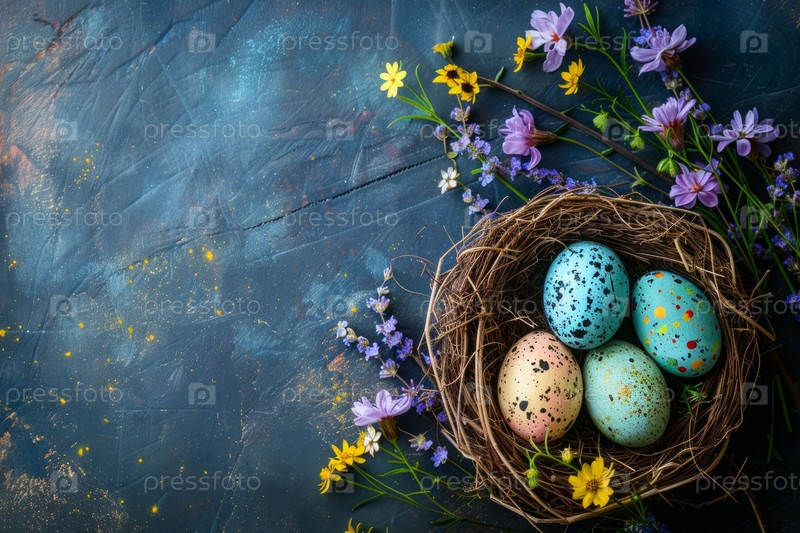 Красочные пасхальные яйца в гнезде и весенние цветы на сером столе
