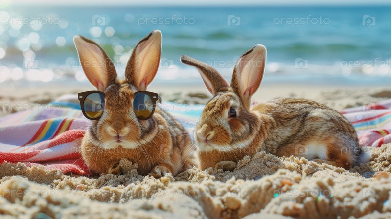 Два милых пасхальных кролика в отпуске на пляжном побережье