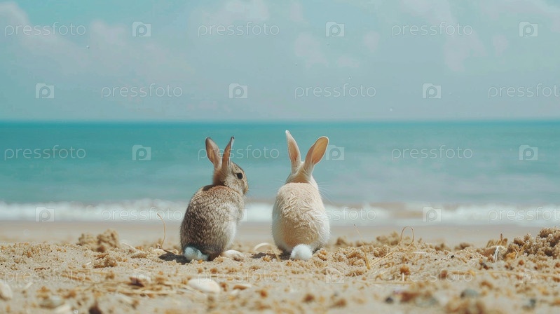 Два милых пасхальных кролика в отпуске у пляжного побережья