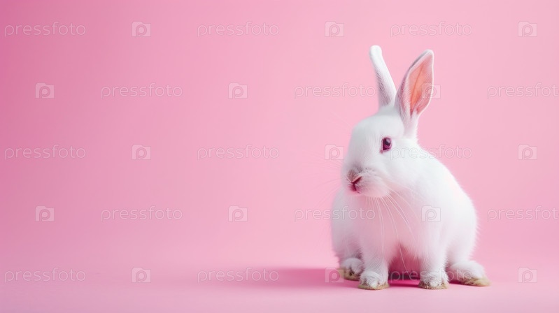 Белый кролик подбирает на светло-розовом фоне
