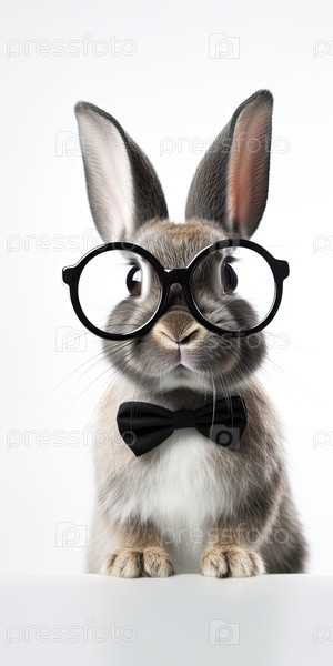 Забавный кролик в черных очках стоит на задних ногах,