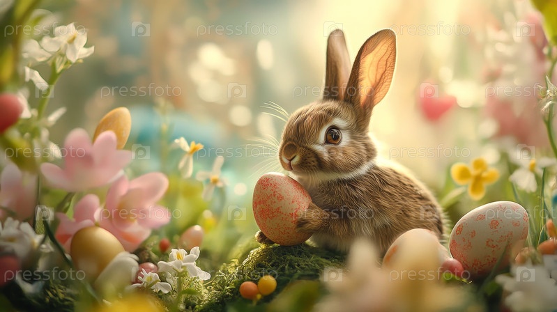 Пасхальный пейзаж, кролики с красочными яйцами и ромашками на лугу под прекрасным небом